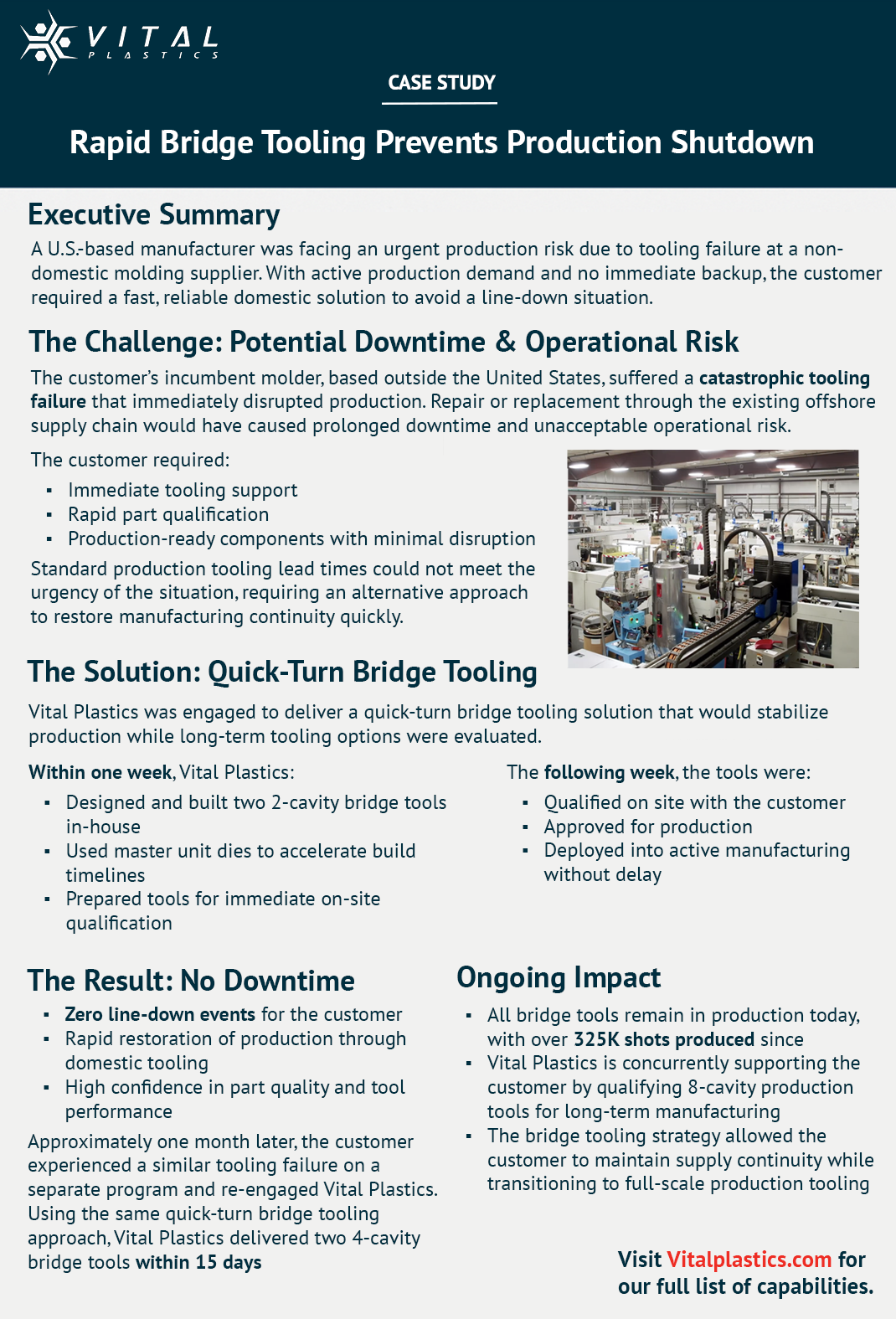 When offshore tooling failed for a U.S.-based manufacturer, Vital Plastics designed, had built, and then qualified bridge tools within one week, preventing any line-down events and protecting production continuity. Vital Plastic’s quick-turn bridge tooling allowed the customer to stabilize operations immediately while long-term production tools were developed, eliminating prolonged downtime risk.